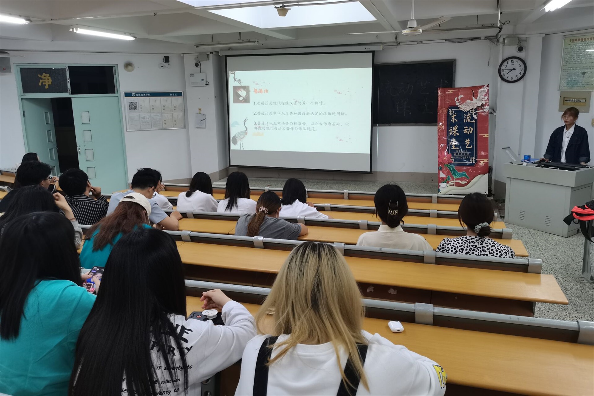随后,主持部负责人从了解普通话及训练、了解普通话易错点、了解主持人三部分内容展开讲解,通过现场互动的方式纠正了同学们普通话交流中存在的问题并结合具体绕口令进一步加深同学们对普通话训练的理解。