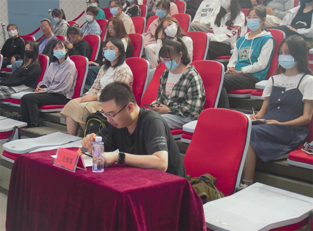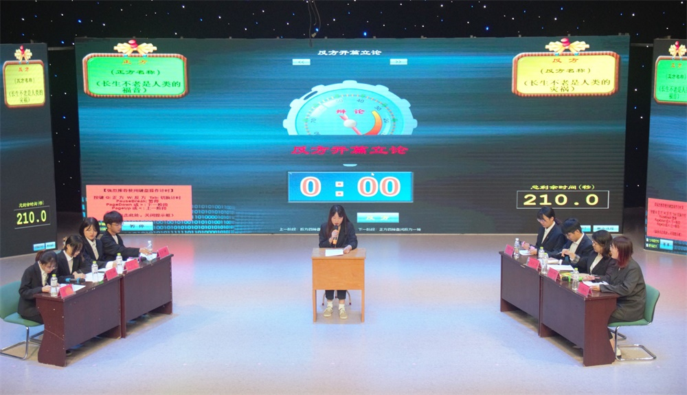 精于思、美于言,秀于心、慧于口。本次表演赛基于疫情防控的要求,采用线上线下相结合的方式进行,在演播厅设立比赛场地并邀请部分观众进行现场观看,并在钉钉上开设直播让更多的学生参与观看。在主持人刘馨怡上台对“长生不老对人类是福音还是灾祸”的辩题进行简要介绍并向在场观众介绍双方辩手后比赛拉开了序幕。在开篇立论的环节中张旭东同学作为正方代表首先发言,紧扣辩题,认为人类在保持年轻的基础上无限延长生命对于人才培养、人类发展都有着不可估量的积极意义。随后,反方四辩也根据正方所提出的观点进行精准的驳斥盘问,认为正方在思考问题时忽略了人口的无限增长所带来的资源短缺等实际问题,为反方一辩表达长生不老是灾祸的持方提供了良好的论证基础。进入自由辩环节,双方辩手更是各显神通,正方提到科学家等若可以长生不老则能够为社会发展持续供能,自然对人类是福音,反方也根据“江山代有才人出”、“一个萝卜一个坑”等现实问题进行反驳,双方唇枪舌战、条理清晰为观众带来了一场精彩纷呈的表演赛。评委老师王传领以辩论爱好者、前辈的身份与在场辩手一起探讨辩题,并提出自己的独到见解,认为生命的价值不在于时间长短才能够表现出来,在有限的时间里一样可以不断升华自身价值,面对现场观众的疑问也进行了深刻的解答。