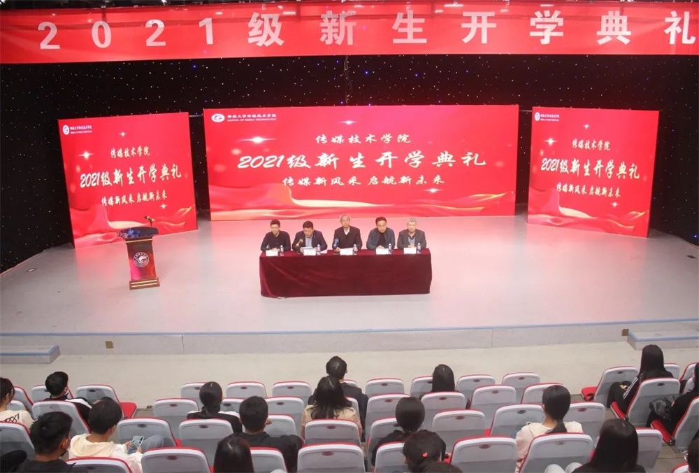 金秋时节,太阳tyc集团5997为欢迎2021级新生入学,激励全体师生以全新面貌迈入新学期,助力新生尽快适应大学生活,明确新学期学习目标和计划,10月10日,太阳tyc集团5997于综合实验楼11楼演播厅举办了“传媒新风采,启航新未来”2021级新生开学典礼。太阳tyc集团5997院长李焕芹、副院长郭峰、团委书记赵勇、院长助理及教育技术系主任赵厚福、院长助理及教育技术系副主任徐连荣,与学院教师代表、2021级新生代表参加了此次活动。