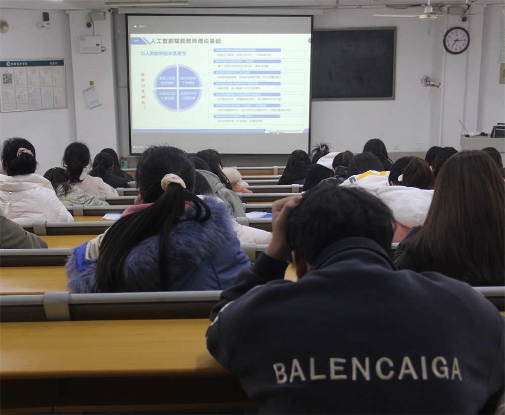 在主持人赵厚福简单介绍主讲嘉宾后,报告会正式拉开帷幕。郭炯围绕“人工智能”这一热点词汇,从人工智能赋能教师理论基础、人工智能赋能教师教育教学表现形态、人机协同背景下教师智能教育素养框架三个大方面展开讲解。