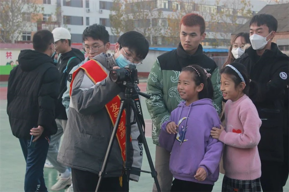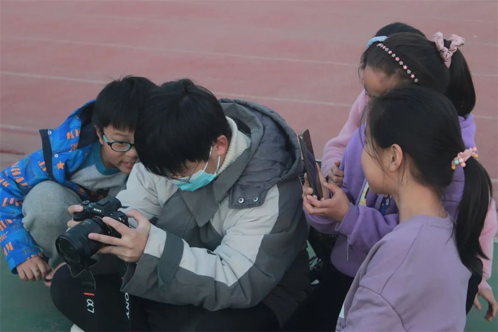 同学们展开自己的想象力与创造力积极实践,将理论知识及时巩固。在操作过程中,同学们踊跃提问,团队成员们积极帮助他们解决问题,解答困惑。针对同学们拍摄出的成品,团队成员提出建议并亲自帮他们修改。课堂接近尾声,团队成员鼓励同学们积极展示并简单介绍自己的拍摄作品,同学们踊跃举手,勇敢展示,收获了团队成员的赞扬,阵阵欢声笑语弥漫在操场。
