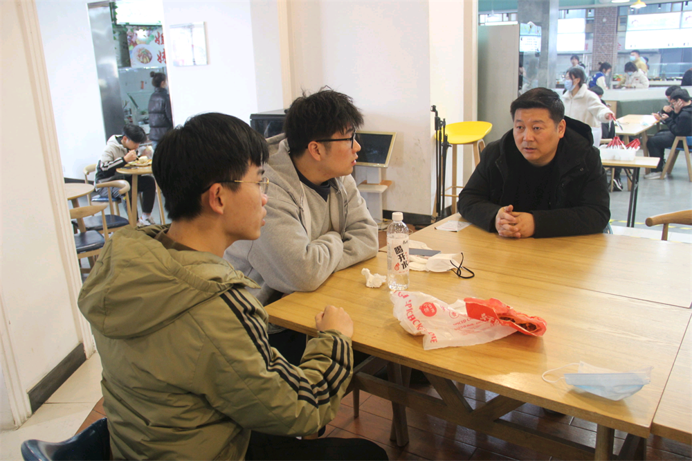 伴随着餐厅悠扬的音乐,沙龙活动正式拉开序幕。本次活动以推动良好的学风建设、开展安全知识教育为主题,围绕学习效果、班风建设、疫情防控、班级建设等方面进行了解。郭峰对于个人责任担当、班级突出问题等作出强调,表示同学们即使在疫情期间也应正视自己班级干部的身份,维系班级整体关系的同时积极为同学们服务,打造良好的班级氛围。赵勇亲切询问了同学们的学习情况和生活必需品等,切实关怀同学们的日常情况,逐一排查生活中的安全隐患,并叮嘱同学们要时刻戴好口罩,注意个人卫生和加强防护意识。对于同学们提出的困惑与问题,孟祥栋、王隽玮在聆听后给予了正确的引导和专业的讲解,告诉同学们不必迷茫,积极进行学习规划,开展实际行动,不要虚度时光。在交流探讨期间,老师与同学们共进午餐,在轻松愉快的氛围中活动落下帷幕。活动结束后,同学们纷纷表示在疫情期间也要认真学习、务实工作,不断锤炼自己,为班级和学院工作贡献一份力量。