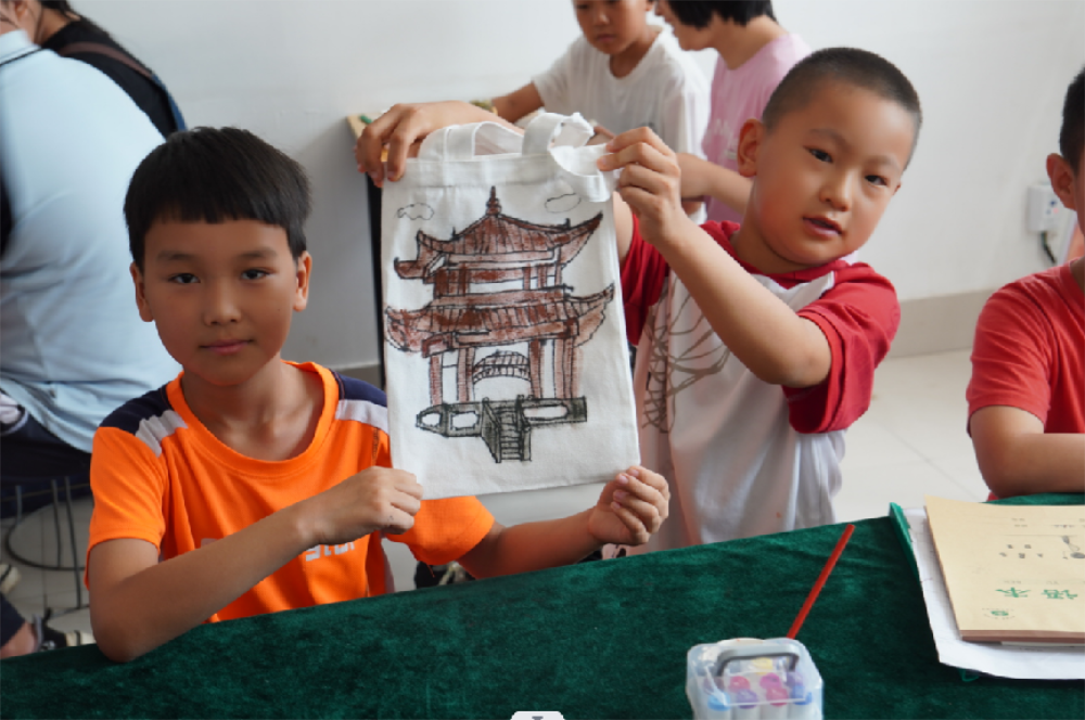 由志愿者向小朋友们分发绘画工具,美术相关专业的志愿者再次详细讲解绘画的具体步骤以及配色、调色等方法。讲解结束后孩子们已经开始大展拳脚了,他们用美丽的色块、丰富的线条绘制了聊城四季、光岳楼、摩天轮、创意树、小房子等各种图案的帆布包,绘画完成后孩子们纷纷拿起自己的作品进行合照,脸上洋溢着灿烂、自豪的笑容。