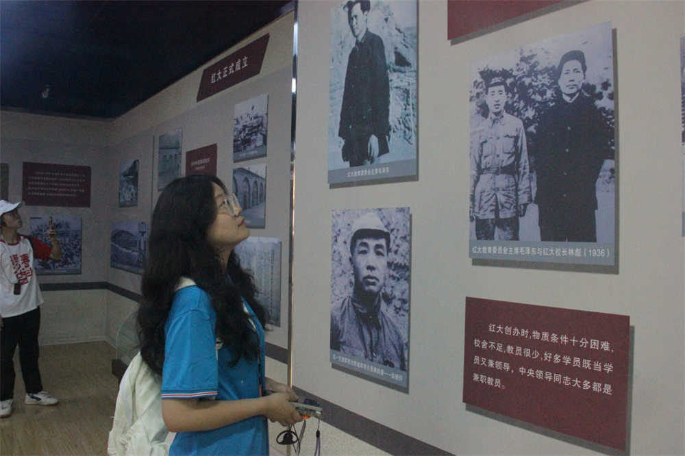 随后,实践队跟随讲解员的步伐,来到中国人民抗日军政大学纪念馆。“抗大”被誉为“培养干部的‘重工业’、制造抗日干部的‘熔炉’、民族解放的‘旗帜’”。展馆中的图片和陈列物品真实地再现了老一辈革命家在此进行革命活动、播撒革命火种的情景,展现了抗大可歌可泣的不朽功绩。通过聆听讲解,观看馆中陈列,队员们深入了解了抗大的创立及发展历程,领悟了抗大精神的深刻内涵。接着,实践队徒步来到延安革命纪念馆,与本期共同实践的24所大学,33支团队一同合唱抗日军政大学校歌,重温入党誓词,在铿锵的歌声与誓言中,理想信念更加坚定。