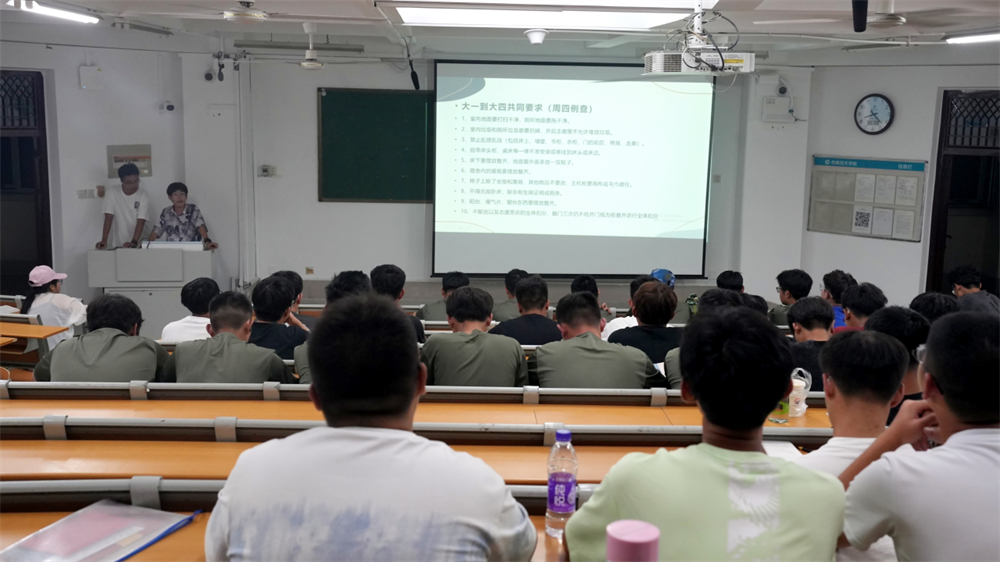 宿管部成员为使新生进一步适应宿舍环境,围绕宿舍扣分制度、宿舍物品摆放、宿舍考勤打卡等方面对同学们进行介绍。同学们纷纷表示对宿舍宿管制度有了更清晰的了解,进一步增强了适应新环境的信心和决心,对未来大学生活充满向往与期待。