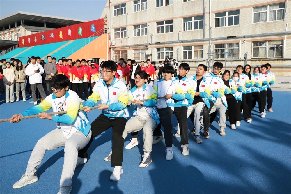 比赛开始,参赛队员们双手紧握长绳、扎实马步、身体重心下压,做好随时发力的准备。随着裁判员的哨声响起,参赛队员们个个精神饱满,全力以赴地投入到比赛当中,他们身体后倾、脚抓地面,咬紧牙关、寸步不让,心往一处想,劲往一处使,铆足劲儿向自己队伍一方拉绳,紧张而激烈的气氛遍布整个队员们奋力拼搏的汗水与观众的呐喊声交织在一起,充分诠释了“技”与“力”的较量,“一二一二”嘹亮的口号,也将比赛推向高潮,为比赛添增了一抹亮色,给参赛选手们带来了无限力量。赛场上参赛队员们铆足干劲、汗如雨下的身影充分展现出学生们团结一致、奋力拼搏的精神风貌。