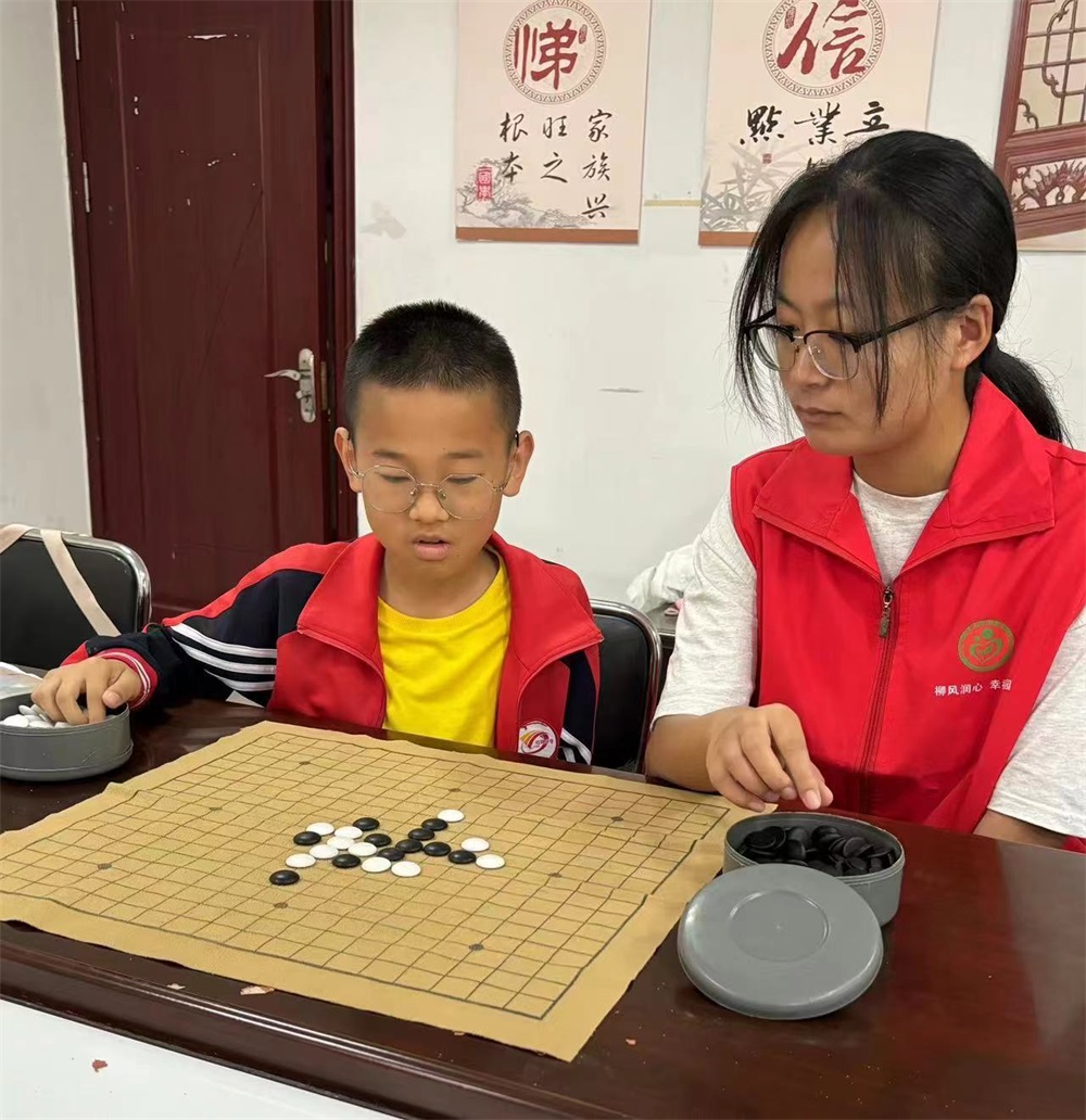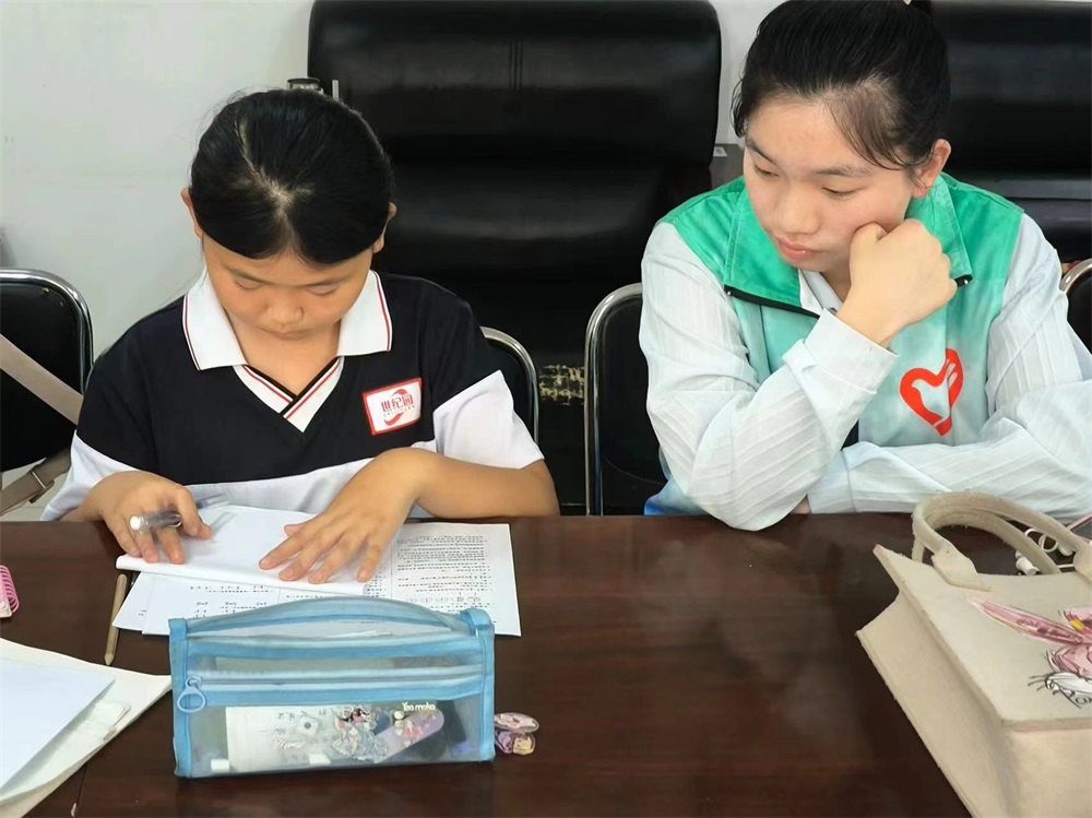 在课业辅导环节,服务队成员采取“一对一”的方式,耐心解答小朋友们在学习中的疑惑,用生动有趣的方式引导他们独立思考,让他们在轻松愉快的氛围中提升学习能力。课间休息时,服务队成员们精心策划了一系列益智游戏,如镜子游戏、反指令游戏、接数字游戏等。孩子们积极参与,与志愿者们互动频繁,这些游戏不仅锻炼了孩子们的记忆力,还提高了他们的思考能力,让他们在轻松愉快的氛围中度过课间时光。