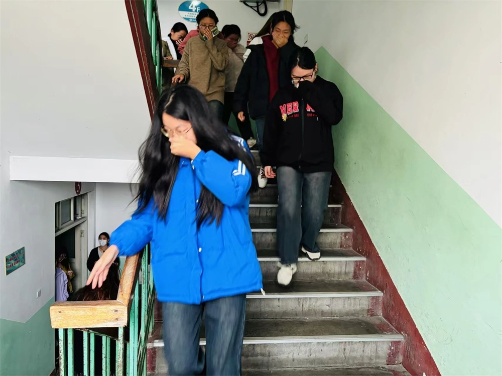 以演筑防,以练为战。本次演练模拟了宿舍楼发生火灾的场景,演练过程中同学们积极参与,紧张有序地完成了各项任务。演练开始前,宿舍管理中心高文文统筹安排好各项工作,工作人员清点人数,并在宿舍楼道内准备好烟饼、消防栓等相关工具。随后,在同学们到达指定位置后,安排工作人员就位,保障本次演练过程中学生们的安全。演练过程中,工作人员吹响哨声模拟消防警报、点燃烟饼,同学们听到警报后立刻做出反应,捂住口鼻、俯身前行,迅速而有序地撤离到安全位置。