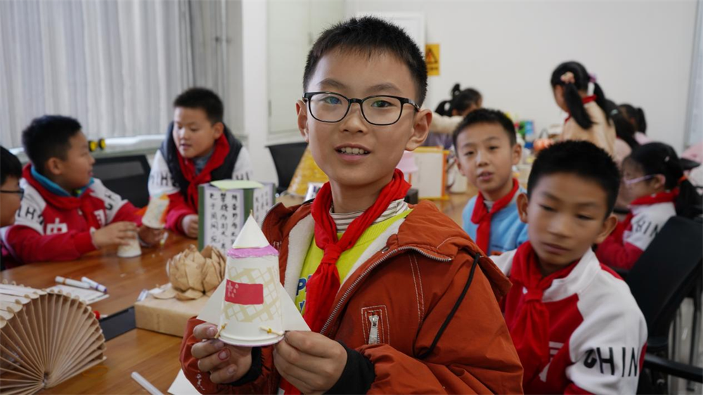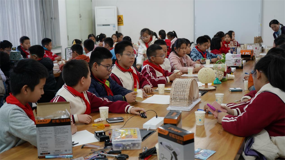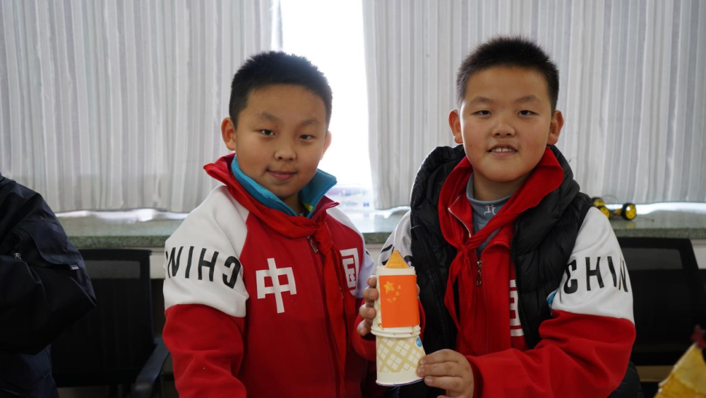 接着,刘晓蕊带领学生们来到手工创意工坊,与他们共同观看了神舟十九号载人飞船成功发射的视频,学生们亲眼见证了火箭升空的震撼时刻,感受到了祖国航天事业的伟大成就。随后,刘晓蕊引领学生们制作火箭手工模型,旨在通过手工制作激发他们对航天科技的兴趣,进一步锻炼动手能力并培养团体意识。活动开始前,刘晓蕊给学生们分发了纸杯、水彩笔、卡纸、剪刀、胶棒等工具,详细说明了手工制作要求,安排六人一组共同制作火箭模型。学生们随即投入到手工制作中,利用卡纸、纸杯等材料制作火箭机体、发动机,进行组装和装饰,还在火箭上画上了自己喜欢的图案,最终在他们的共同努力下成功完成火箭模型制作。活动结束后,聊大附小学生表示,通过观影和手工制作,加深了他们对传统文化和环保理念的理解,也激发了对航天科技与艺术创作的热爱和追求。