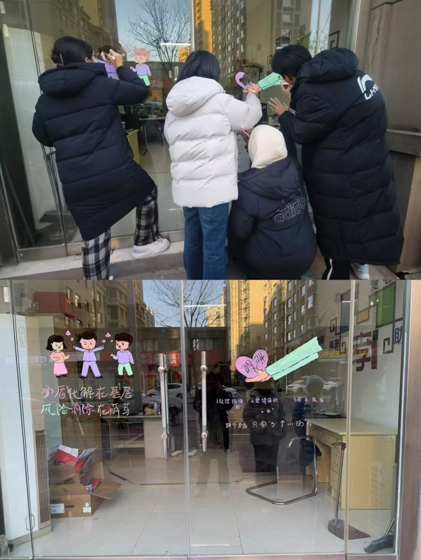 青春入基层,实干筑乡情。活动期间,团队成员分别前往各自家乡的社区,深入了解了所在社区的日常工作,积极投身服务实践。恰逢腊八节,在山东省聊城市开发区东城街道的大胡社区,部分团队成员与社工携手,挨家挨户为居民送上腊八粥并致以节日祝福。考虑到春节将至,他们充分发挥专业优势,精心构思图案,用饱含民俗风情的笔触,为社区绘制了独具特色的蛇年文化门,营造了浓浓的节日氛围。