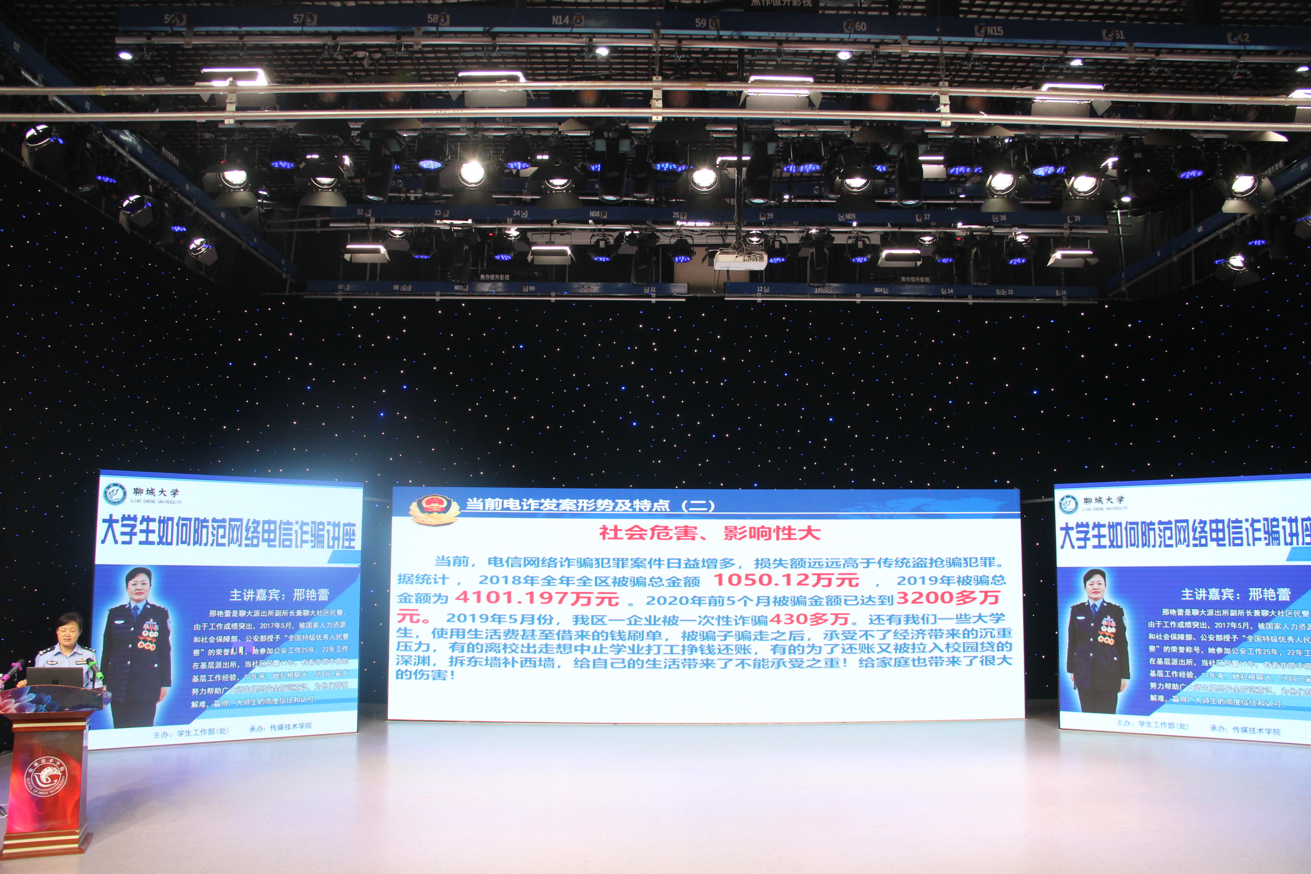 本次我院邀请了聊大派出所副所长兼聊大社区民警邢艳蕾为主讲人,通过生活中的真实案例和自身从警多年来的实践经验,邢艳蕾从电信网络诈骗定义、当前电诈发案形势及特点、大学生常见电诈类型、如何防范电信网络诈骗、被骗后的补救措施五个方面向同学们展开科普教育。邢艳蕾指出,近年来电信网络诈骗发案成几何级增长,诈骗手段层出不穷,防范打击电信网络诈骗犯罪的形势十分严峻复杂。