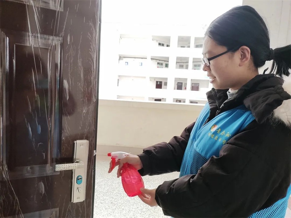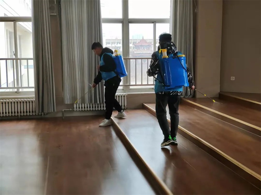 志愿者们与学生党员事先确定各自负责教室,自行成组、默契配合,以饱满的热情和十足的干劲投入到消杀工作中,不放过每一个死角,切实排除教室内的防控隐患。教室消杀工作完成后,志愿者们与学生党员分为四组,分别前往学苑一、学苑三、学苑五、紫藤八学生公寓,对公寓内大厅、楼道、走廊等公共区域的卫生环境进行严格把控并完成全公寓的消杀通风工作,确保防控措施落实到细、不留空白。