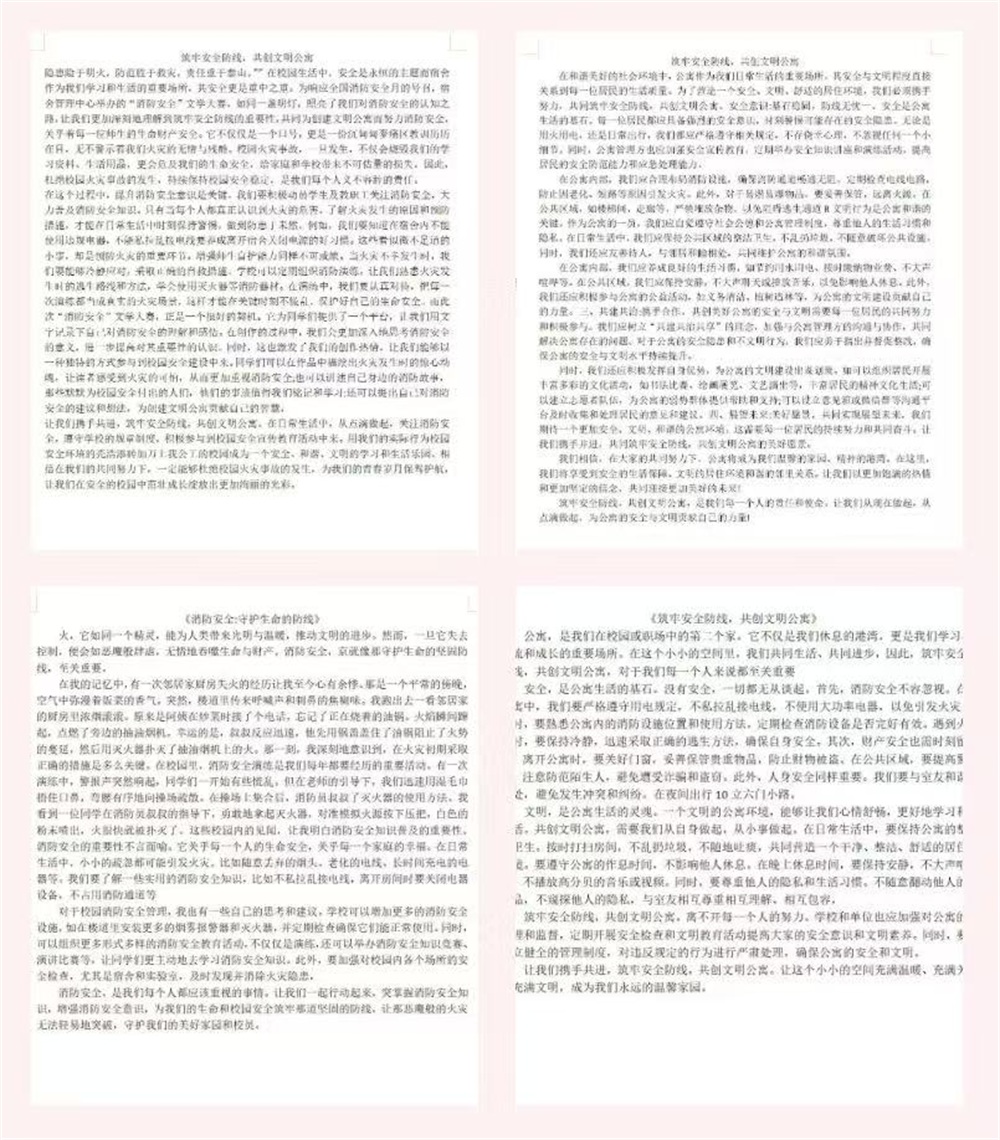 文韵筑安全防线,笔墨绘消防画卷。活动期间,同学们反响热烈、踊跃投稿,以文字为载体,记录下自己对消防安全的深刻感悟与独特思考。参赛作品题材丰富多样,精彩纷呈,部分作品以第一人称视角,生动地再现了火灾现场的惊险场景,同时详细阐述了在危急关头如何保持冷静,并运用所学消防知识展开自救互救的亲身经历,使读者如临其境;另有一些作品巧妙构思虚构情节,将消防安全知识自然融入其中,深刻彰显了预防火灾、珍爱生命的重大意义;还有不少作品采用议论文或诗歌体裁,深入剖析了当前社会消防安全面临的严峻挑战,并积极探讨青年学子应如何主动承担起传播消防安全知识、共建安全校园的责任与使命。每一篇参赛作品都凝聚着同学们对消防安全的深刻认知与真切感悟,充分展现出他们敏锐的社会责任感和扎实的文学素养。