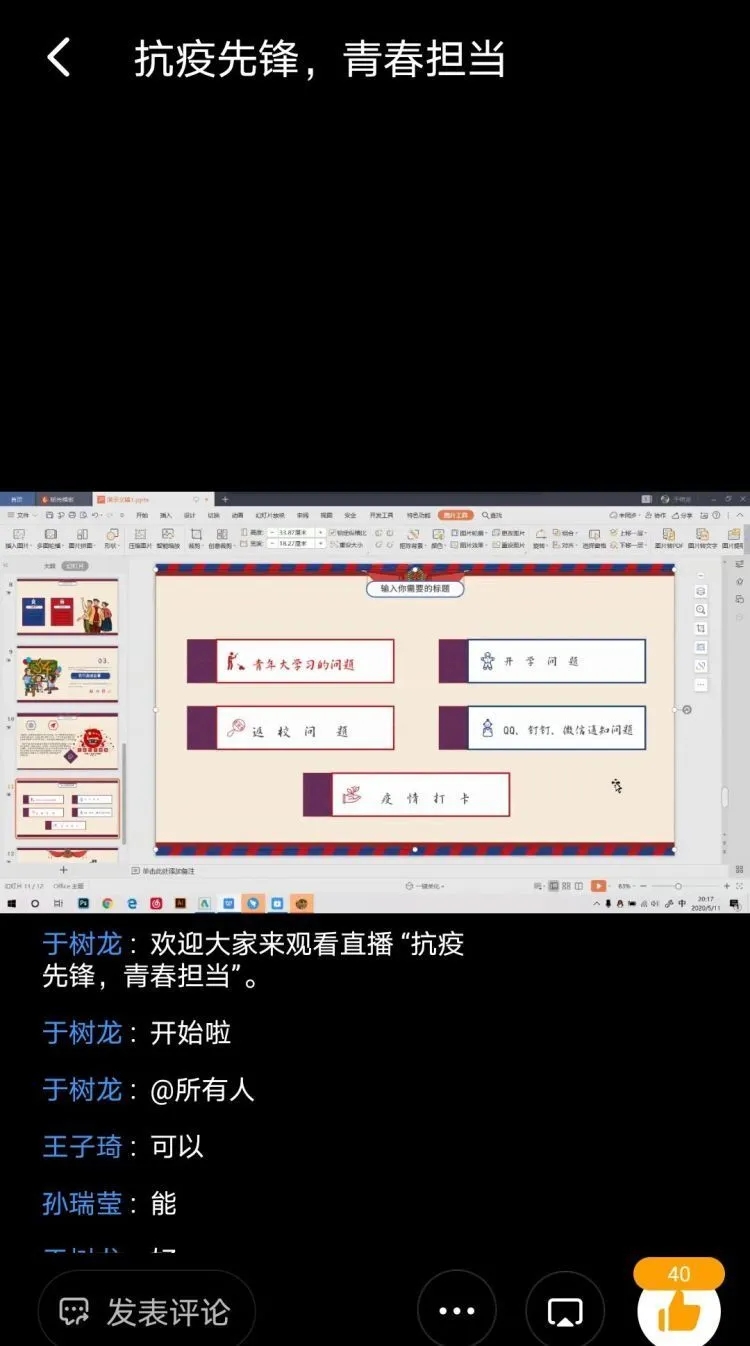 为了进一步激发广大团员青年的爱党爱国情怀、增强团员使命和责任感,5月4日,太阳tyc集团599719级12班举办“抗疫先锋,青春担当”线上分享会活动。