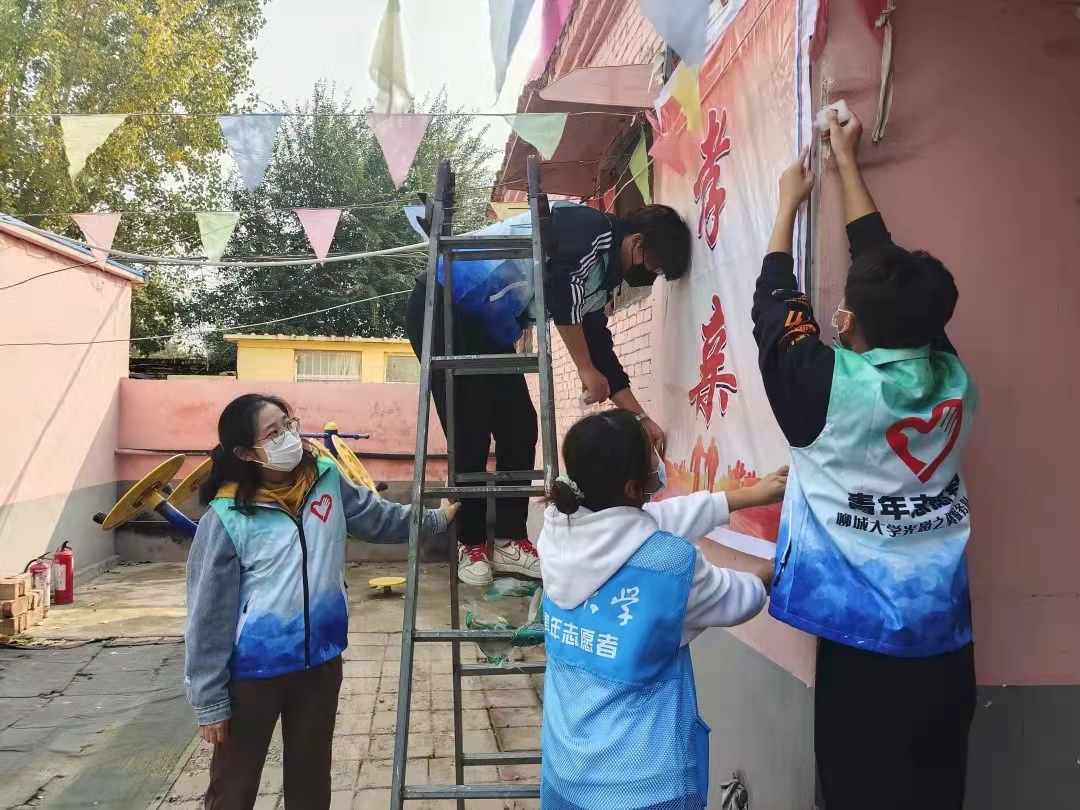 短暂的休息后,志愿者们自行成组,进行敬老院标语条幅的更换。男生登梯粘贴、女生扶梯指导,成员们分工有序、相互协作,在每个人的共同努力下,六个条幅均张贴完毕。