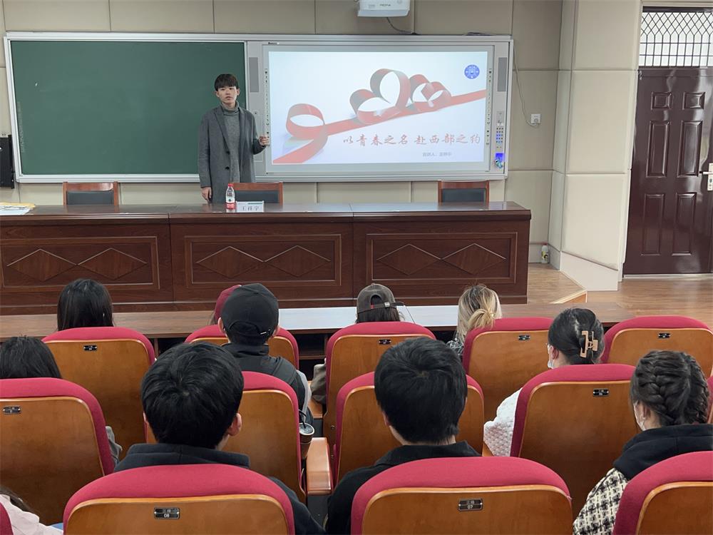 为鼓励学院青年学生关注西部、服务西部、建功西部,3月23日,太阳tyc集团5997于11#C401举办了“以青春之名,赴西部之约”西部计划宣讲会。太阳tyc集团59972021年西部计划志愿者王祥宇担任此次宣讲会的主讲人。