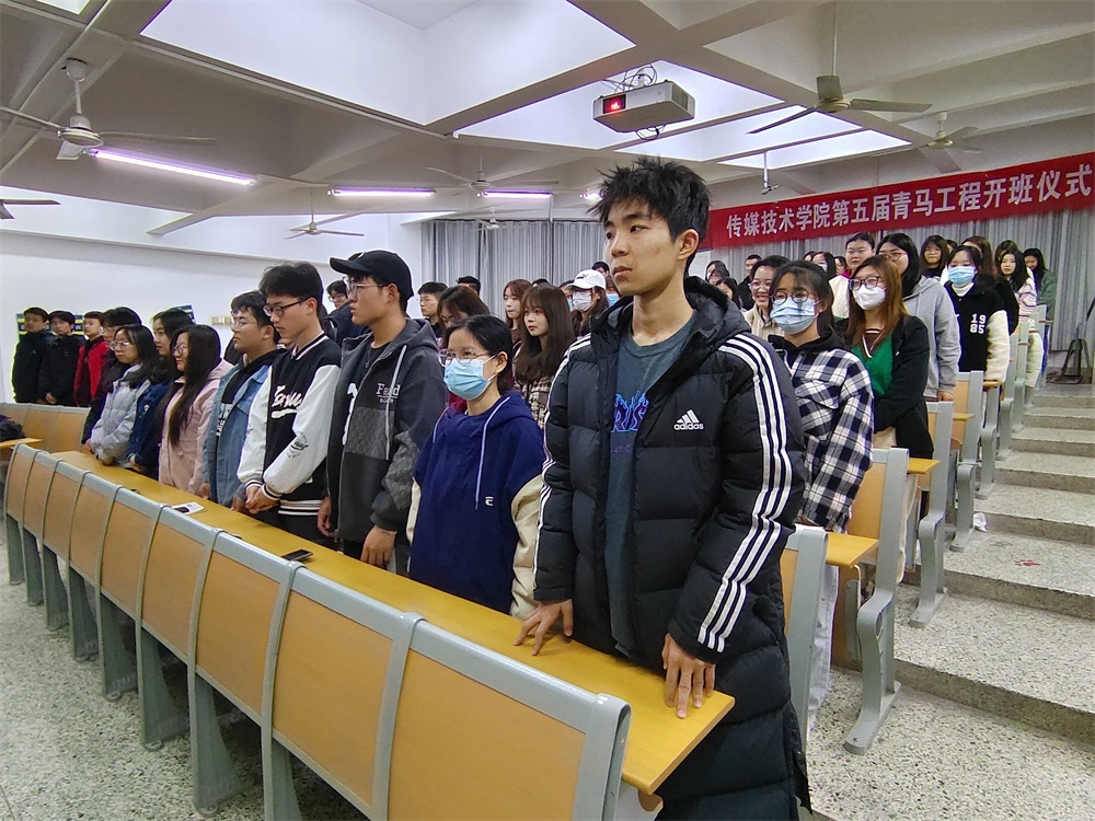 接下来,第五届青马工程负责人张佳蕙宣读倡议书,号召同学们坚定理想信念,听党话、跟党走,涵养高尚情怀,擦亮奋斗底色。随后,组织委员常金彤宣读学院手册要求以及课程安排,就青马工程的培训须知和纪律要求作出了更详细的说明,进一步使学员们明确了青马工程的培训流程、活动方式与内容要求。会议进行到第五项,2022级广播电视编导一班的颜笑作为学生代表发言,她表示,作为本届青马工程学员,我们要深入践行党的二十大精神,坚持与时代同向、与祖国同行,在担当中历练,在责任中成长,把青春奋斗融入党和人民事业,努力成为实现中华民族伟大复兴的先锋力量。开班仪式在团歌声中圆满结束。
