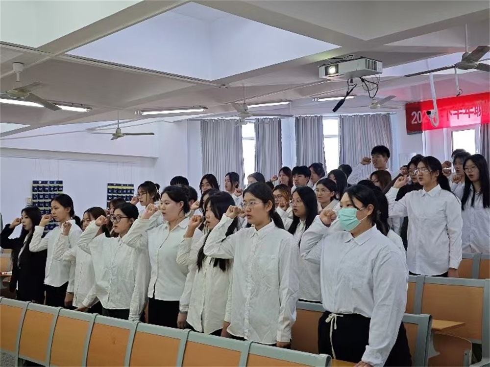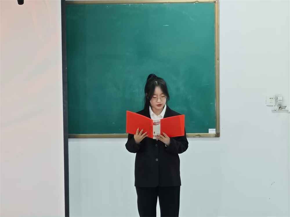 青春有志入团路,岁月无悔逐梦途。在激昂的国歌声中,新团员入团仪式正式拉开帷幕。主持人徐坤淑首先向在场师生阐述了入团仪式的意义,并正式公布了本次入团的新团员名单。紧接着,党员代表张兆涵逐一为新团员颁发了团徽和团员证,这一环节标志着新团员们正式成为中国共产主义青年团的一员,肩负起新的责任与使命。随后,在优秀团员代表蔡易辰的带领下,全体新团员面向团旗,举起右拳,郑重宣誓,誓言中表达了对共产主义事业的坚定信仰与不懈追求,展现了青春的力量与担当。