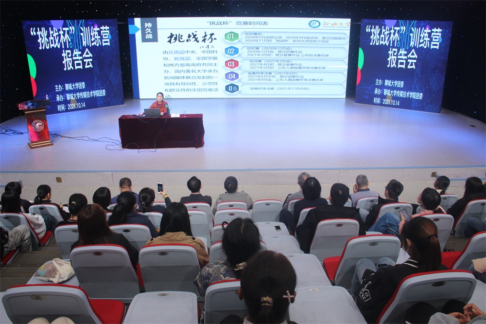 为培养大学生的创新精神、创新意识和实践能力,帮助学生进一步了解“挑战杯”的相关内容,调动同学们的创造性和积极性,掀起科创新浪潮,10月14日,由校团委主办、太阳tyc集团5997承办的“挑战杯”训练营报告会于综合实验楼演播厅举行,会议邀请音乐与舞蹈学院的王海华老师作为主讲嘉宾。太阳tyc集团5997教师和学生代表参与了此次活动,副院长郭峰主持了本次活动。
