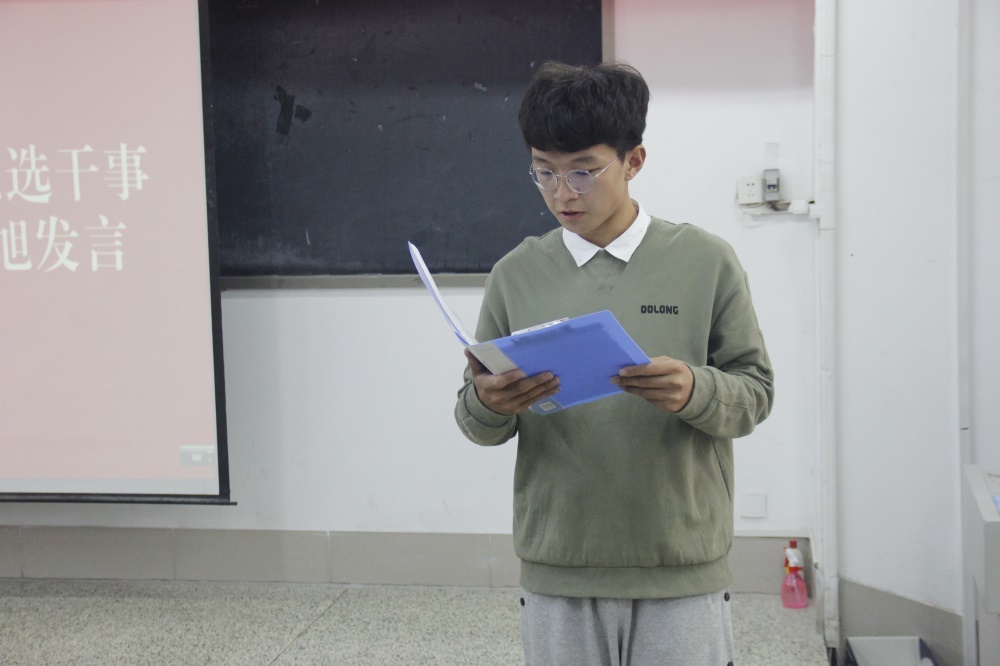 在最后的环节,2021届预选干事代表李柠旭进行发言,他表示同学们要从紧抓学习理论基础、熟练基本操作技能、交流分享工作经验三个方面提升和改善自我,不断吸取借鉴他人优秀之处,找到自身的不足,形成更加坚定的理想信念。