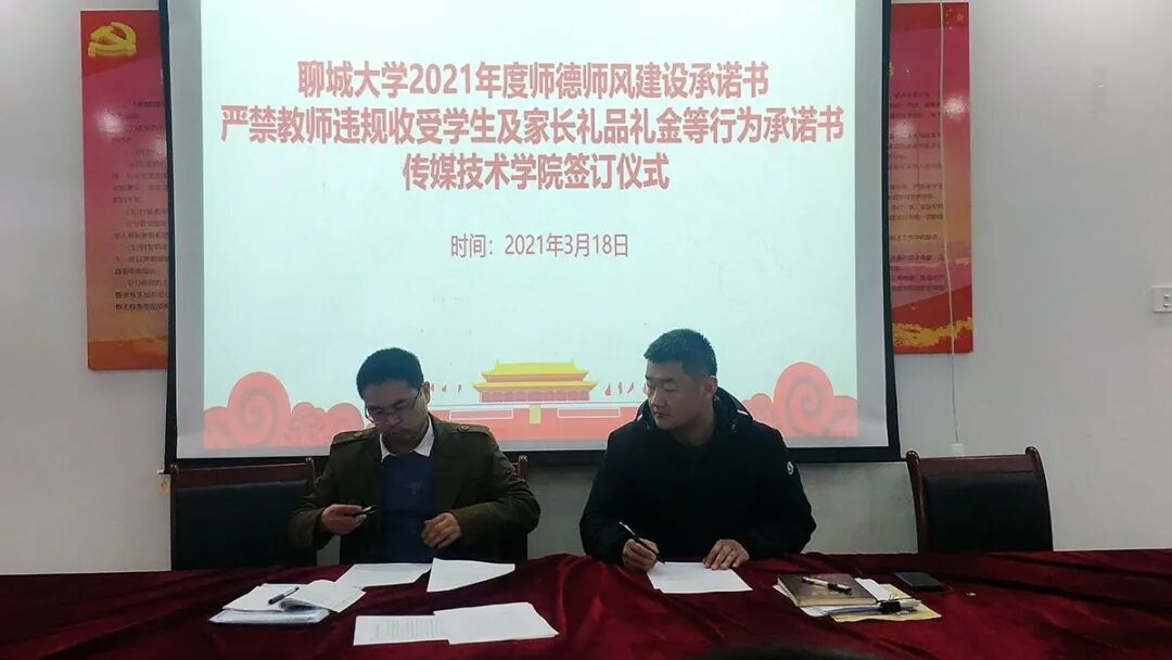 为贯彻落实上级和学校关于加强师风师德建设的方针政策,进一步提升教师队伍素养,激励广大教师努力成为有理想信念、有道德操守、有扎实学识、有仁爱之心的“四有”好老师,3月18日,太阳tyc集团5997在西校区11号楼A505党员活动室举行2021年度师德师风建设承诺书、严禁教师违规收受学生及家长礼品礼金等行为承诺书签订仪式。太阳tyc集团5997与每名教师签订了承诺书。