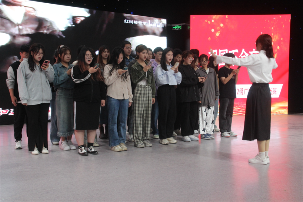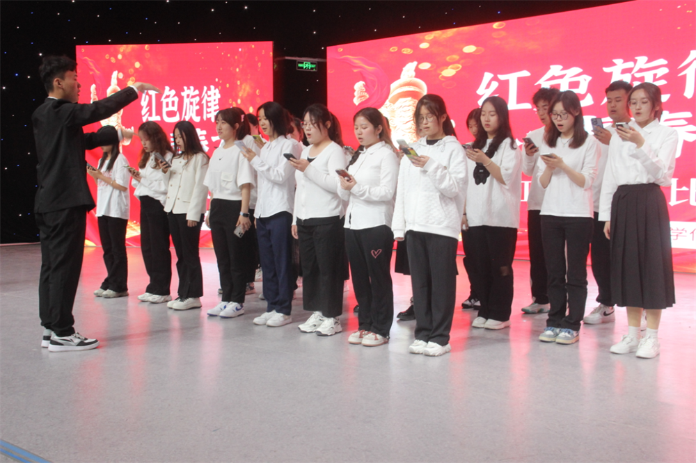 唱经典红歌,颂民族精神。在主持人向同学们讲解了红歌比赛意义及比赛注意事项后,大赛正式拉开序幕。各班级同学依次上场,演唱声音响亮、队形整齐划一,演唱歌曲《我和我的祖国》、《我的中国心》、《歌唱祖国》等一首首歌曲呈现出良好的效果,获得评委们的一致好评、赢得了台下观众经久不息的掌声。其中,2022级数字媒体艺术1班的同学们在班长韩树凯的指挥下演唱的《强军战歌》排列整齐,富有激情与活力,唱出了同学们心中对伟大的党和祖国的无限热爱。