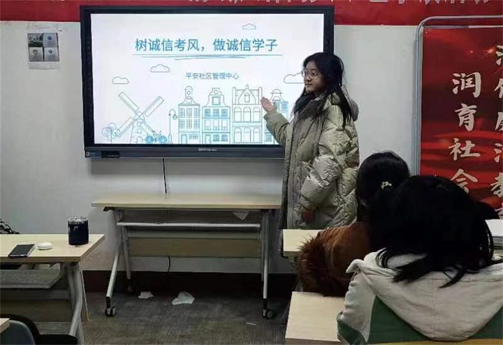 诚信考试树新风,端正态度立考风。活动前期,平安社区通过宣传栏、宣传横幅等形式广泛宣传诚信考试的重要性,营造了浓厚的诚信考试氛围。活动伊始,宣讲人首先向同学们介绍了诚信考试的重要意义,强调诚信是社会主义核心价值观的重要组成部分,是中华民族的传统美德。随后,宣讲人通过列举一些考试作弊的案例,分析了作弊行为对个人、家庭和社会的危害,引导同学们深刻认识到诚信考试的重要性。