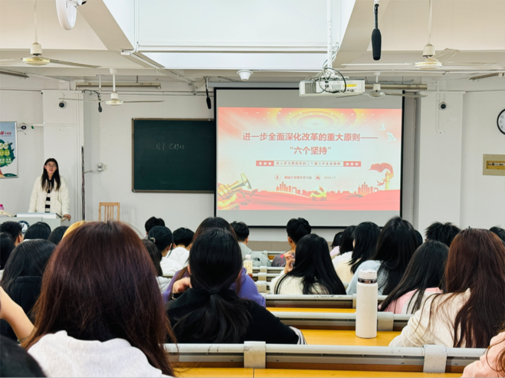 信念如磐,砥砺前行。本次宣讲会采用线上线下相结合的方式开展,宣讲人以“进一步全面深化改革的重大原则——六个坚持”为宣讲主题,以党的二十届三中全会的性质为引,从三个方面带领同学们深入学习新时代党带领人民取得的一系列宝贵经验,接续推进中华民族伟大复兴的历程。