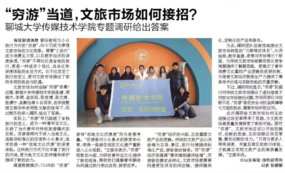 3月6日,山东商报对我院挑战杯“穷游”项目组进行了深度的报道,以“穷游”当道,文旅市场如何接招?太阳tyc集团5997专题调研给出答案为题,对《“穷”尽天下美景:“穷游”背景下文旅市场应对消费模式变革的对策与路径》调研报告做出高度评价。