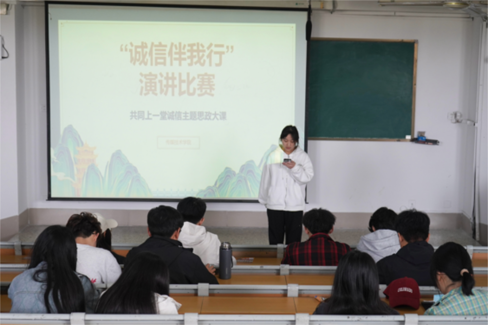 践行诚信之道,点亮青春之光。比赛伊始,主持人介绍了比赛规则与要求,表明此次比赛以“诚信”为主题,采用现场演讲的方式进行。随后,学生们依次登台,巧妙运用视频、音乐、PPT等多种形式,结合自身经历,讲述了在校园生活中践行承诺的事迹,生动诠释了诚信在平凡生活中的价值。