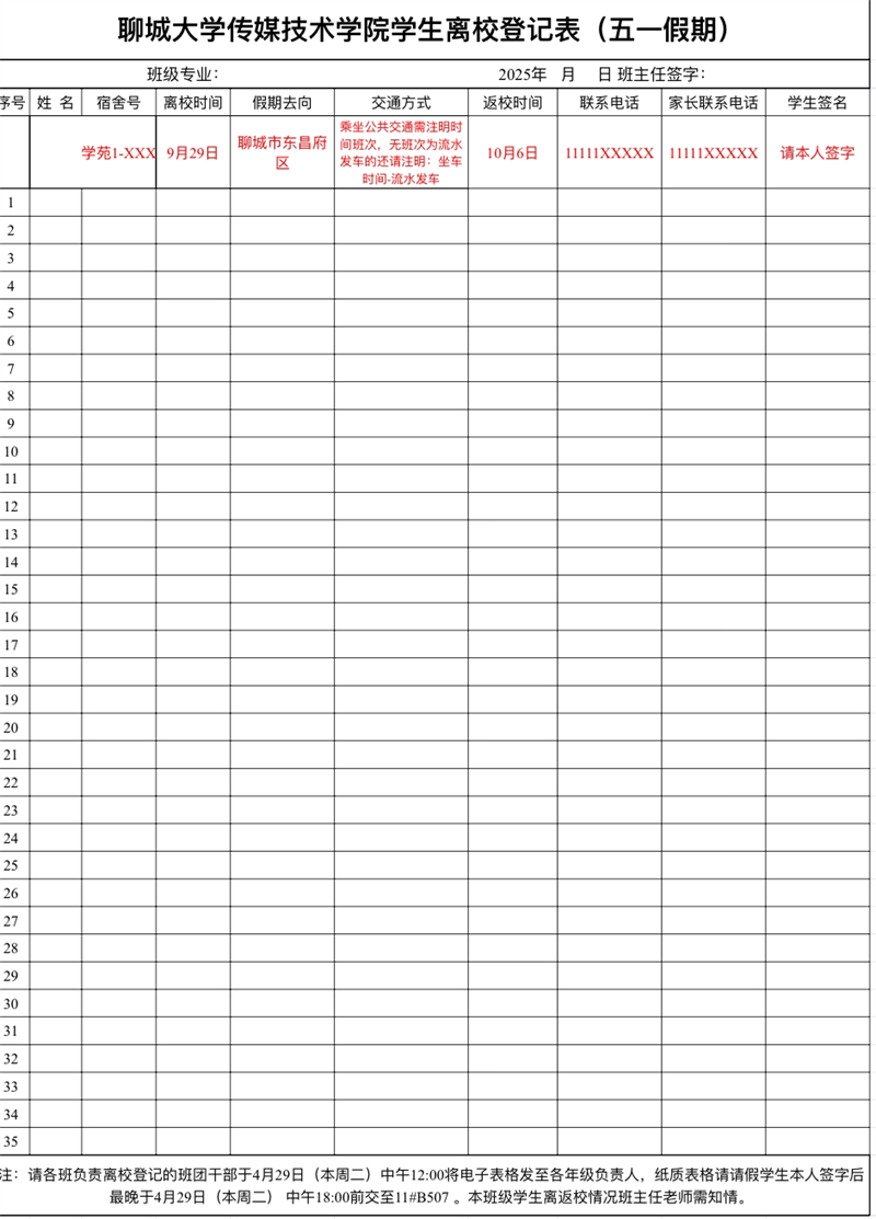 (1)离校前填写《离校登记表》,明确离校时间、返程时间及去向,班级负责人归总至纪律检查中心。