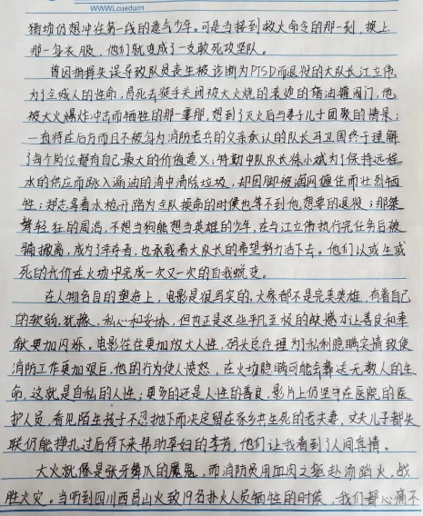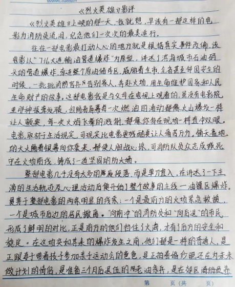 此次活动由组织者发布观看影片《烈火英雄》的通知,参与者自行观看影片,并根据所观看的内容写下自己的真情实感,写成影评,发送至组织者的邮箱中,进行影评评比。活动的评奖依据影评内容和书面进行参考,由苏博老师进行评选。在上交影评作品中,有的同学表示,消防员是伟大的职业,解救危难中的人群尽显英雄本色,激发了人们对生活的热爱和身边人的感激,了解更多的消防知识,也使我们更加明白“保护自己,就是保护他人”的道理。也有同学在作品中表示,《烈火英雄》中最令自己动容的是消防员们坚守责任,面对熊熊烈火,在危急时刻毅然选择了牺牲自己、守护他人,自己也会努力学习他们的伟大精神,会愿意为了心中所敬所爱之人,提高心理素质,热爱生活,保护自己。