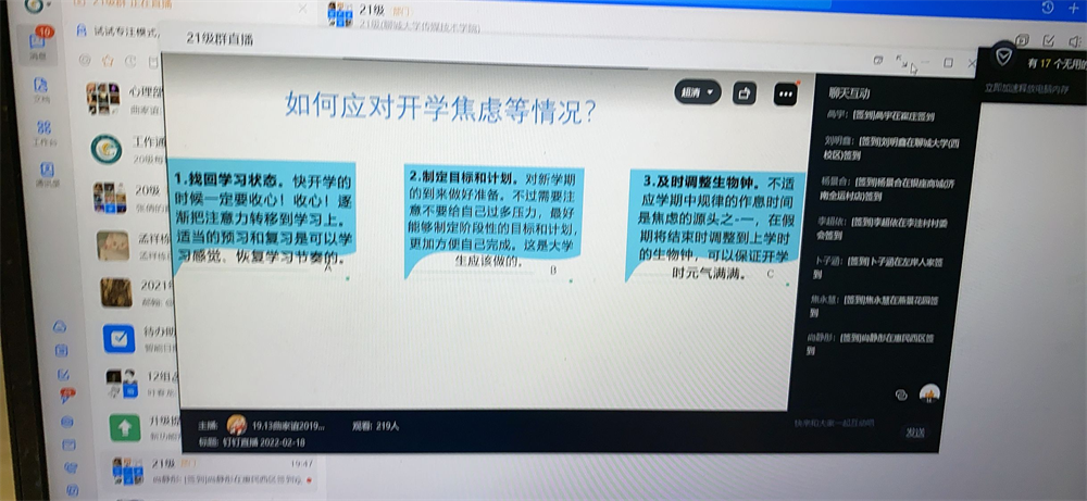 为帮助同学们尽快适应疫情防控常态化形势下的学习、生活模式,调整状态投入新学期校园生活中,掌握正确的自我心理调试方法,2月18日,太阳tyc集团5997举办了“调整心态,从心起航”线上心理讲座活动。