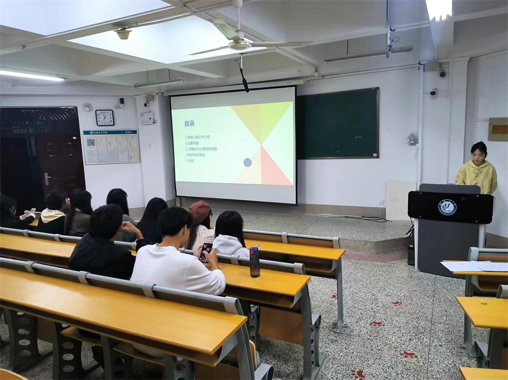 会议上,主讲学姐首先阐述了心理委员的工作任务和职责原则,强调了心理委员在班级里面的重要性。点明学院心理工作后,接着提出了关于定期进行心理危机排查这一工作,然后详细介绍了需要排查的内容,排查时间和次数。要求心理委员们及时发现心理状况不太好的同学,并及时反馈给心理老师或心理教育服务中心。随后,例会中提出希望同学们能够及时关注并积极参加心理教育服务中心在到梦空间举办的心理相关方面的活动,并鼓励班里同学一起参与,最后学姐对全体成员的工作做了肯定,也对接下来工作的开展提出了指导意见。并鼓励大家踊跃参加接下来的朋辈心理辅导员的面试。