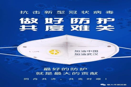 疫情当前,举国奋战。新型冠状病毒感染的肺炎疫情牵动着每一个中国人的心。天佑中华,共克时艰。为了向所有奋战在疫情一线的工作人员致以聊大学子的崇敬之情,为了向处于武汉等地的同胞送上最诚挚的祝福,也为了动员全体学生全力做好疫情防控工作,传媒学子积极参与“青春战‘疫’,我们在一起”主题创作活动,为武汉加油,为中国加油!万众一心,众志成城。我们虽未身处疫情第一线,但是也可以通过我们的作品为武汉、为中国摇旗呐喊!