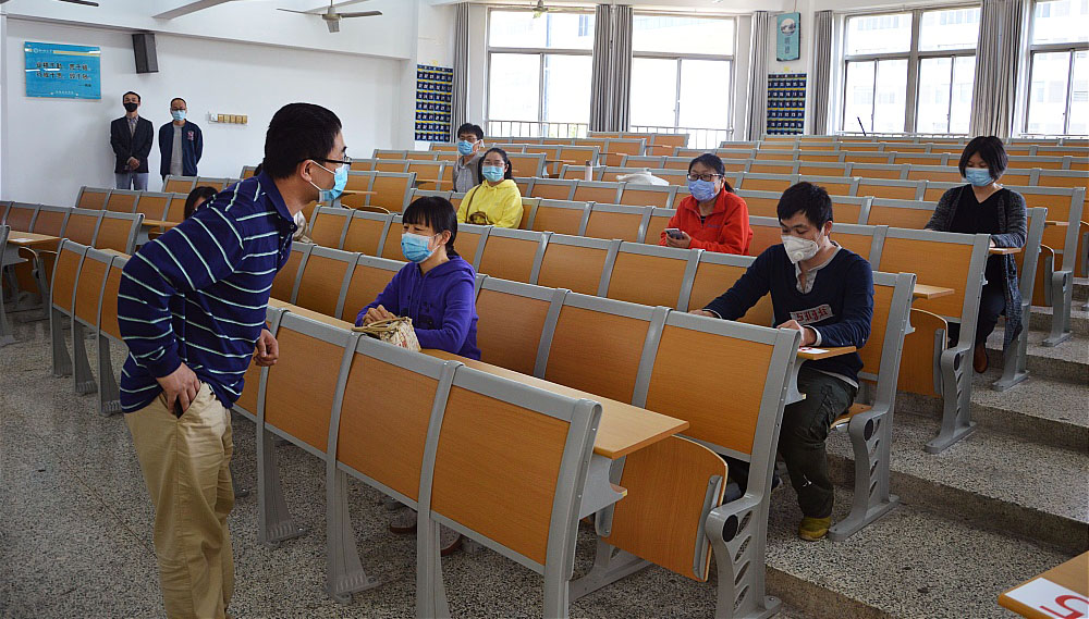 学生排队进入教学楼。由引导员李彦组织上课学生佩戴好口罩,在11号教学楼外排队等候进入教学楼,学生相互间隔距离2米。