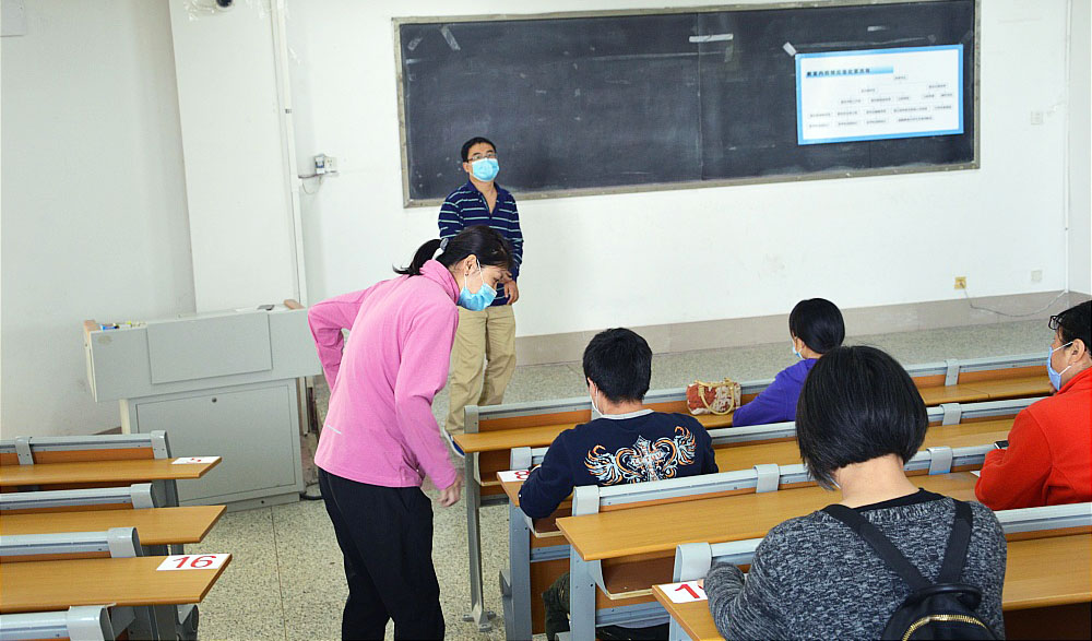 教室就座。通过体测检测的学生依次有序由南侧楼梯进入A404教室,班主任郑新、任课教师郭玉真提示学生佩戴好口罩,单人单桌,按标识入座。
