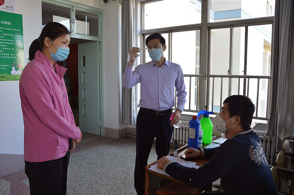 体温测量。学生经过消毒地毯后进入体温检测区。检测员苏鑫着防护套装A,使用额温枪逐一检测学生体温,放行正常体温的学生。经检测全部学生体测正常,可进入教室学习。