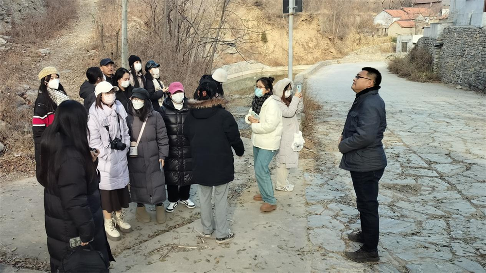 第二站,同学们来到了上端士村。上端士居民建筑群位于淄博市淄川区太河镇南部,“古树高低屋,斜阳近远山”是这处古村落的真实写照,同学们在古村落中走访调研,认真记录和感受着这份丰厚的文化遗产和人文底蕴。