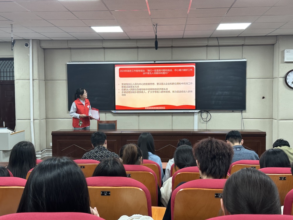 本次或的那个主题为“聚焦两会精神,凝聚奋斗力量”,许倩首先从两会知识入手,为大家详细介绍了“两会”的概念、召开时间及其重要性;随后用视频引导大家了解2023年我国取得的主要成就,包括经济快速发展、科技创新突破等各个方面;其次对“新质生产力”“以人民为中心”等两会关键词进行深入讲解,并强调了其对国家发展的重要性;最后以“我们的新征程”结尾,号召大家在新时代新征程中不懈奋斗,开拓进取。