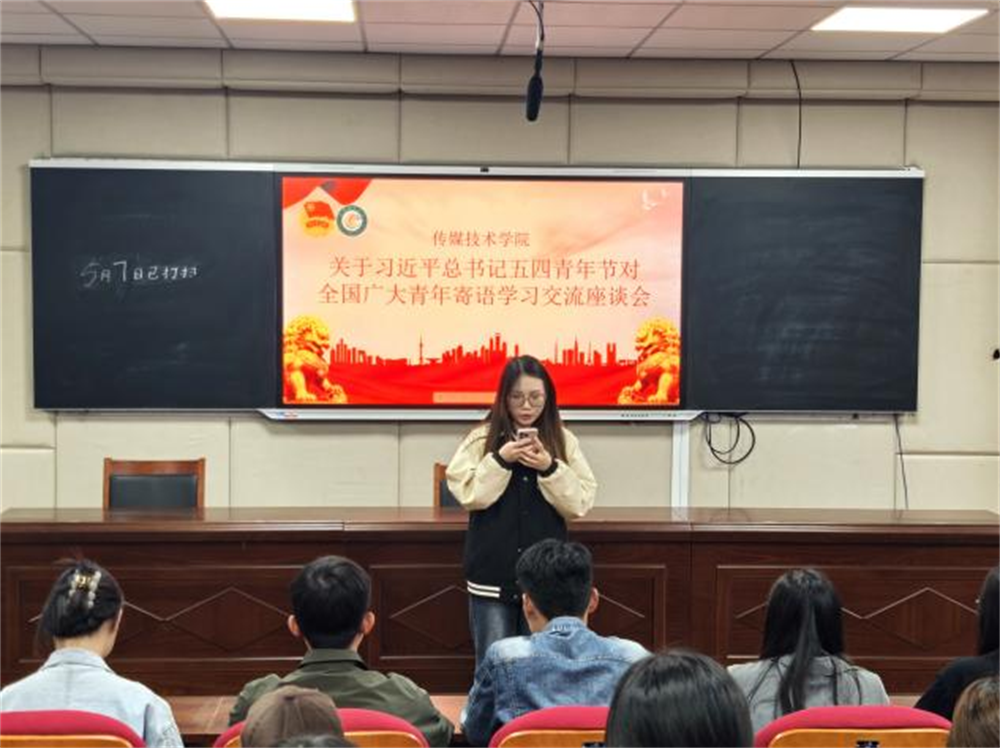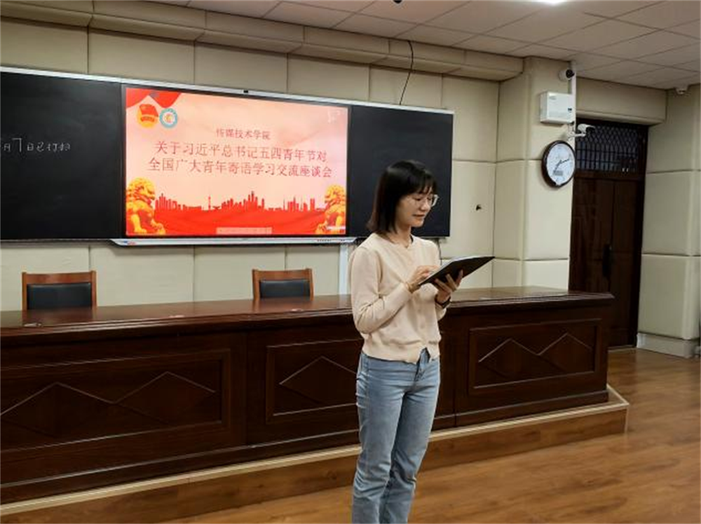 主讲人常金彤阅读了习近平总书记五四青年节对全国广大青年寄语的主要内容,并分析了寄语重点。习近平总书记提到,青年的命运,从来都同时代紧密相连。105年前,一大批先进青年在纷纷觉醒,伟大的五四运动促进了马克思主义在中国的传播,拉开了新民主主义革命的序幕。一百多年来,在党的坚强领导下,一代又一代青年坚定信念,紧跟党走,谱写了中华民族伟大复兴进程中激昂的青春乐章。习近平总书记的寄语令同学们备受鼓舞。