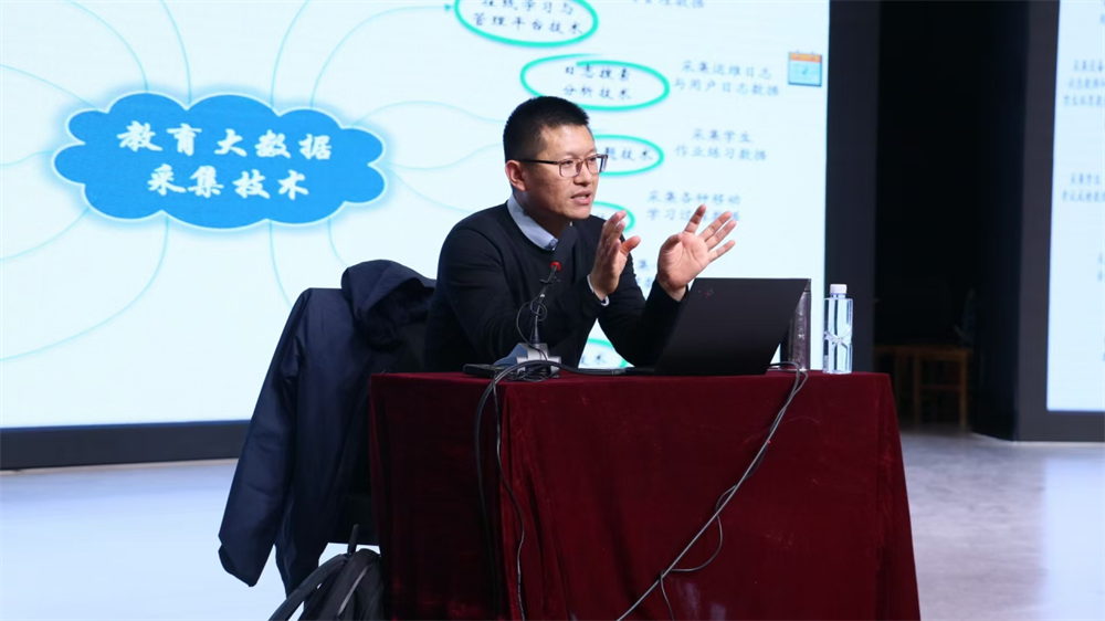 讲座开始前,郭峰院长对杨现民教授的专业造诣和学术权威给予了高度评价,并对其到来表示热烈欢迎。报告中,杨现民教授首先介绍了研究数据的伴随式采集。他指出,教育大数据采集技术体系已日臻完善,包括四大类、十三种常见数据采集技术。伴随式数据采集作为当前研究的热点,其优势在于无干扰、数据量大、低成本、高效率、多模态,能够支持更多元、更深度的研究分析,同时保持研究本真,结果可信度高。