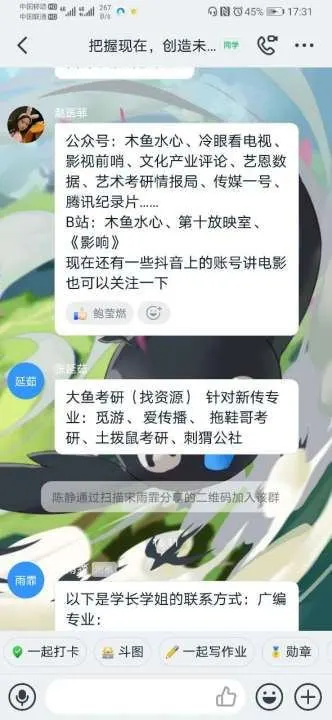 路漫漫其修远兮,吾将上下而求索。本次考研交流会采取钉钉直播的方式开展。主持人致开场词之后,教育技术与广播电视编导专业2016级优秀考研代表张星义、赵医菲、张延茹、陈为丽、王宗美、崔肖肖、焦杰、郭烁等人依次进行自我介绍并结合自身情况讲述考研经历。代表们详细介绍了自己从确立考研目标、制定学习计划到考前精准复习的过程,告诫考研学生们要合理规划考研计划。同时,也为同学们提供了最新的关于教育技术专业、广播电视编导专业的考研动向以及更多的考研高校,尽最大可能解决同学们的考研盲点。其中,考研代表张星义以其考取的西北大学为例,针对专业课的系统复习方法为同学们总结出了做真题、看论文和参考书、积累文化热点、背诵书写四个关键点。此外,张星义同学还聚焦考研大项英语政治的学习,向同学们展示了自己的学习计划与流程,分享学习经验,并向在家学习但效率底下的考研学子们提出了严于律己的建议。最后的直播互动答疑环节,同学们积极提问,向代表们询问关于自主学习、跨专业考研、科研奖项等问题。代表们耐心为学弟学妹们指点考研迷津,交流个人感悟。同学们纷纷表示深刻体会到了考研的严肃性和人生规划的重要性,要紧跟优秀考研代表们的步伐,明确目标,加强自身专业学习,提高自身人文科学修养和考研能力。